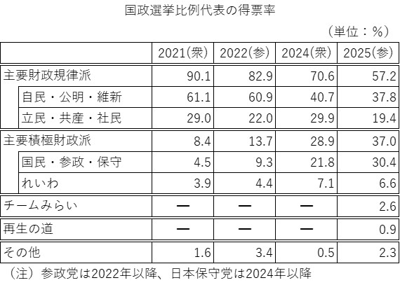 旧聞に属することだが、7月20日の参院選について述べたい。国民民主党が山尾問題等でやらかしたことから、私は以前のブログで「投票率が下がる一方で、れいわ・参政が伸びる」と予想したが、国民民主に対する期待は私が懸念していたほどはしぼまず、投票率はむしろ上がった。そして、れいわと参政は予想通り伸長した。この結果、財政規律派の退潮は鮮明となり、積極財政派が躍進して比例代表での合計得票率は4割に迫った。